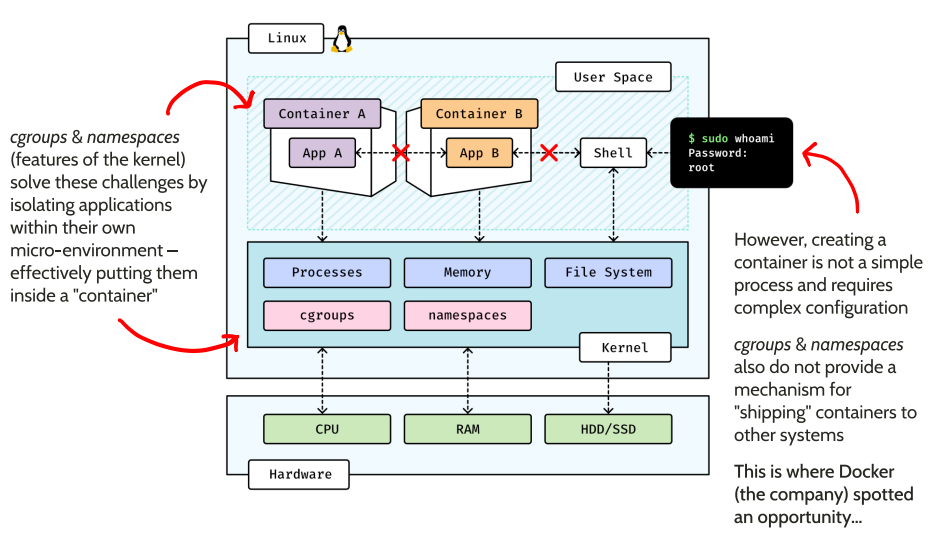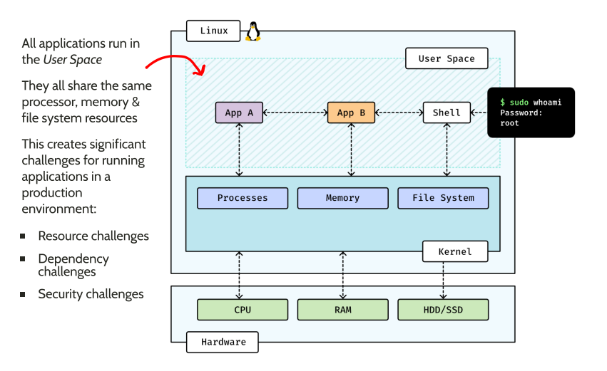In ordinary user space applications share the same processor, memory and file system resources. This increases the likelihood of resourcing challenges, dependency conflicts and security threats. Without modularisation and the titration of resources, you are opened up to much greater possibility of failure.